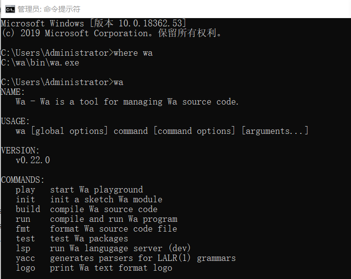 然后重新打开Windows的命令行窗口程序,输入where wa查看凹语言编译器对应的wa命令安装情况: