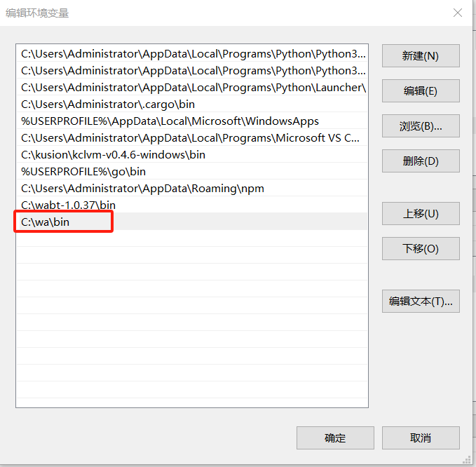 然后将bin目录对应的C:\wa\bin路径添加到当前系统的PATH环境变量中。