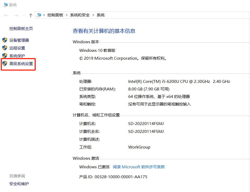 在左边侧栏选中“高级系统设置”,打开系统属性对话框: