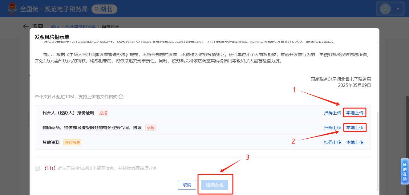 上传身份证正反面照片、服务协议PDF,点击“继续办理”
