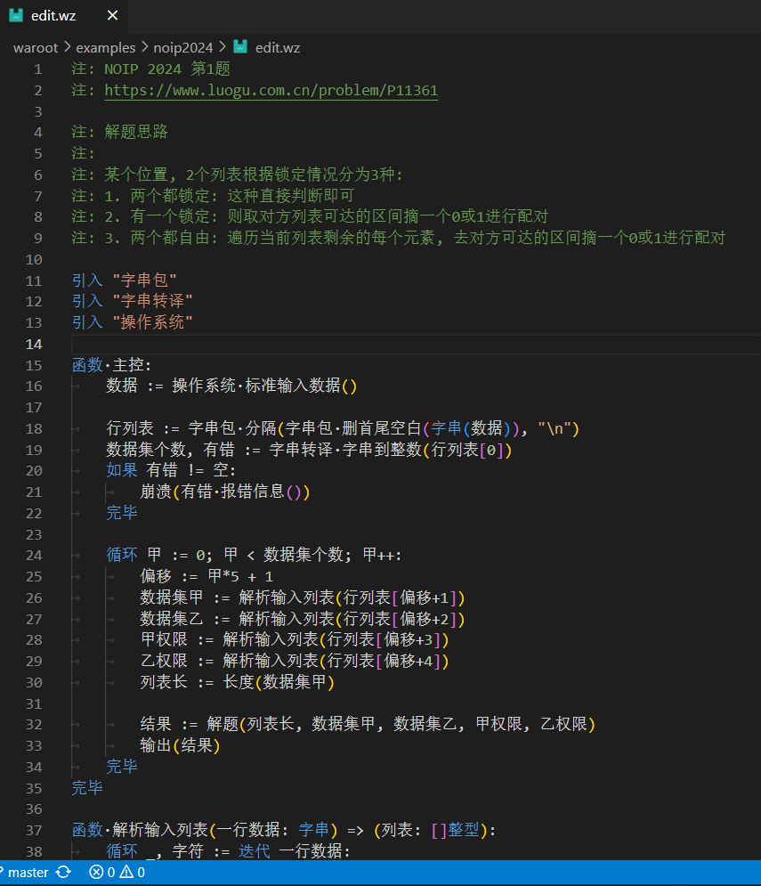 完整的代码:https://gitcode.com/wa-lang/wa/blob/master/waroot/examples/noip2024/edit.wz