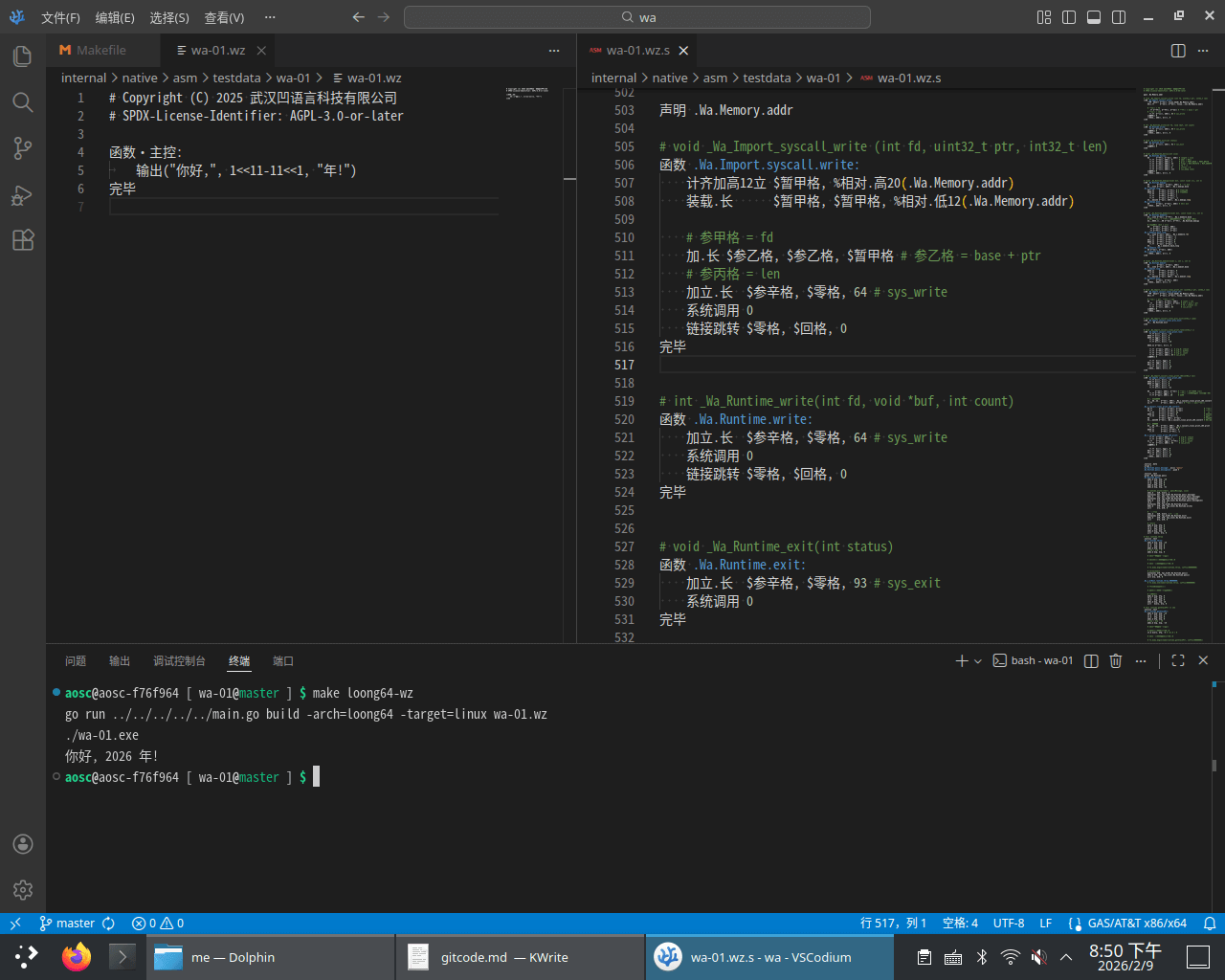 我们期待以此次适配为起点,后续在性能优化、生态工具完善、工业场景适配等方面进行更深入的探索。未来,凹语言将持续深化与龙芯生态的协同,为国产基础软件与核心硬件的协同创新积累实践经验,通过凹语言英文前端语法结合中文汉字编程语法,在通用编程语言国际化和本土化方向如何融合共存方向进行更多探索。